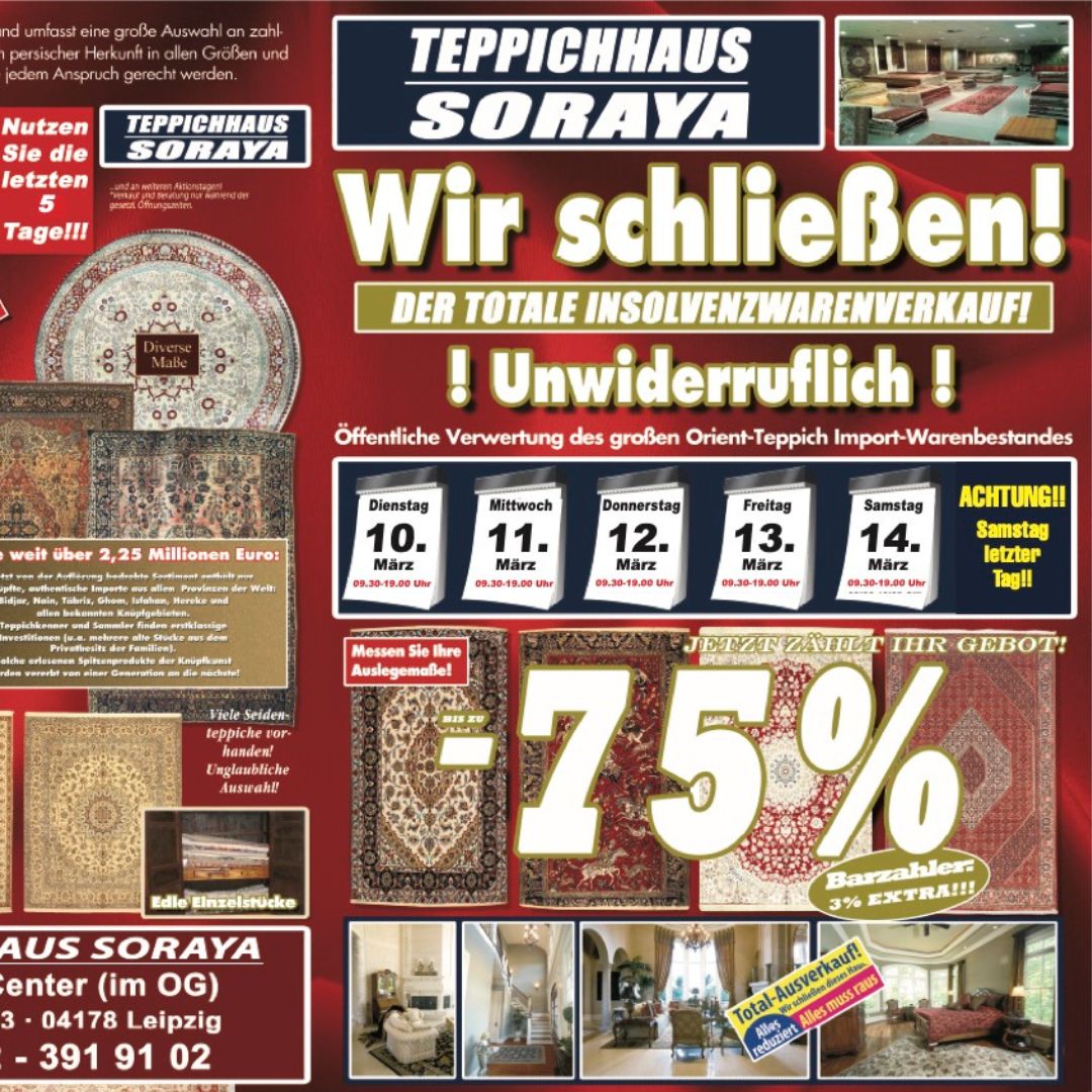 Wenn Preise purzeln, liegen Schnäppchen auf dem Teppich: Das Teppichhaus Soraya startet den großen Insolvenz-Warenverkauf bei und im Löwen Center. Alle Teppiche – ohne Wenn und Aber – sind ausnahmslos bis zu 70 % reduziert. Orient-Teppiche aus Keschan, Nepal oder Maschad stapeln sich zu absoluten Hammerpreisen. Vom 10.–14. März, jeweils 9.30–19 Uhr im Löwen Center Leipzig!
